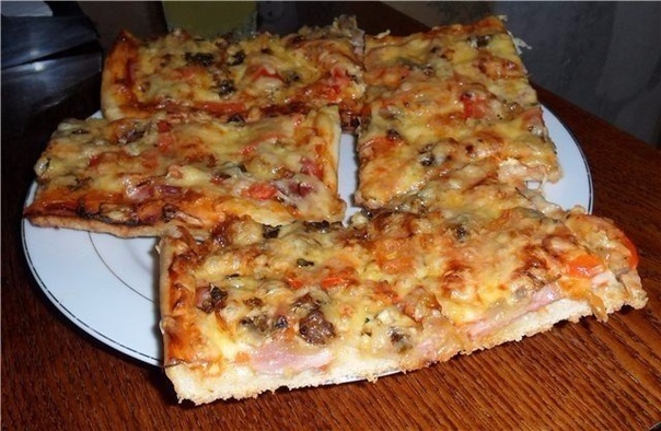 Рецепт домашней пиццы Домашняя пицца как из пиццерии? Нет, намного лучше! Ингредиенты: Показать полностью… Для теста: - по одному стакану кефира и воды; - 7 стаканов муки; - столовая ложка сухих дрожжей; - 5 столовых ложек растительного масла (душистого подсолнечного); - столовая ложка сахара; - чайная ложка соли. Для начинки: - 500 гр. колбасы можно двух / трех видов (у меня сырокопченая и вареная); - 100 гр. твердого сыра; -10-15 шт. оливок; - майонез и кетчуп – по 3-4 ст. ложки; - 3 помидора; - крупная белая луковица; - 1 болгарский перец. Приготовление: 1) соединяем кефир, соль, сахар, масло. Нагреваем до 35 градусов воду (чтобы теплая была), добавляем дрожжи. Когда дрожжи поднялись «шапкой» (минут 5-8), соединяем кефир и дрожжевую воду; 2) добавляем муку (предварительно просеять), замешиваем тесто. Накрываем х/б полотенцем. Ждем 40-45 минут времени. Если на кухне холодно, то тесто поднимается дольше – 1,5-2 часа. Ориентир – тесто должно вырасти вдвое; 3) пока тесто подходит, делаем нарезку: колбаску режем «соломкой» или «квадратиком». Помидоры разрезаем пополам, вырезаем попки и нарезаем тонкими дольками. Лук режем полукольцами (я еще перерезала надвое). Перец можно резать или соломкой или квадратиком. Сыр трем на мелкой терке; 4) смазываем маслом противень, распределяем тесто по форме. Смажьте маслом и руки, чтоб тесто к ним не липло; 5) слегка посыпаем тесто черным перчиком, затем смазываем кетчупом; 6) выкладываем слой колбасы; 7) слой перца и помидоров; оливки; 9) майонез; 10) сыр. Выпекаем пиццу 35-45 минут. Температура в духовке – 200 гр.Всем приятного аппетита!